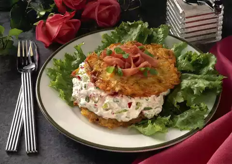 Cut the salmon ham into strips. Mix quark, cream and horseradish, fold in vegetables, season with salt and pepper. Heat oil in a pan. Fry 8 potato pancakes one after the other from the potato mixture and keep warm until everything is fried.
