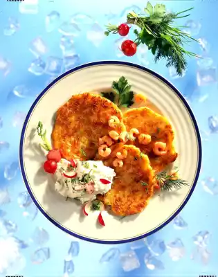 Season with salt and pepper. Fry the potato pancakes in hot fat for 3-4 minutes until golden brown. Turn several times in between. Arrange 3-4 buffers each with some curd cheese and crabs on a plate