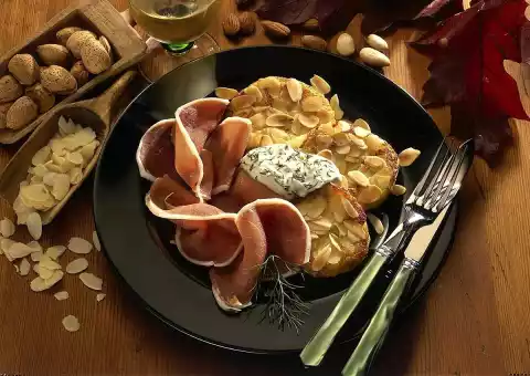 Sprinkle with flaked almonds. Fry on each side for 2-3 minutes on medium heat until golden brown. Arrange cookies, ham and dip garnished with fresh herbs on plates.