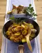 Remove the sausage from the skin and cut into small cubes. Clean and wash spring onions and cut into thin rings. Mix the sausage and spring onions with the marinade and cover and leave to stand