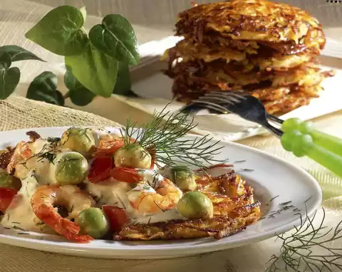 Wash, peel and finely grate the potatoes. Mix in egg, flour and remaining onions and season with salt and pepper. Heat some clarified butter in a frying pan and bake about 12 potato pancakes in portions while turning.