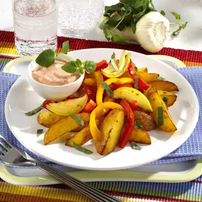 Peel garlic and press it through the garlic press. Mix with quark and paprika pulp and season with salt and pepper. Put them in a cold place. Heat oil in a pan and fry onions for about 2 minutes. Fry the potatoes for 10-15 minutes while turning. Fry the peppers for the last 5 minutes. Season with salt and pepper. Wash oregano and dab dry. Pluck off the leaves and cut into strips.