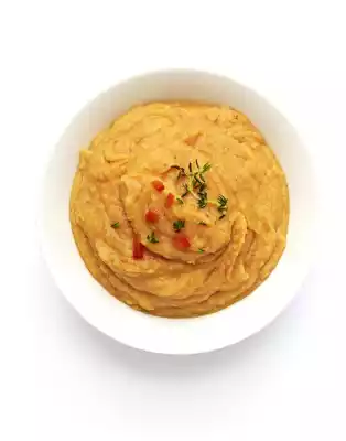 Add thyme, aiwar and milk and stir in. Season to taste with salt. Arrange the puree, garnish with thyme and sprinkle with diced paprika.