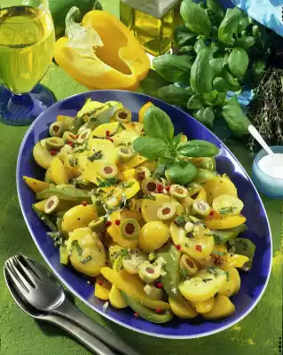 Cut the potatoes into slices. Bring the stock to the boil in 1/8 l water. Steam the peppers for 3-4 minutes. Mix with the potatoes in a large salad bowl. Leave to stand for about 30 minutes.