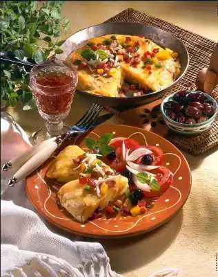 Mix eggs and milk, season with salt and pepper. Pour over the potato-paprika pan and let it simmer at low heat under closed lid for 15-20 minutes. Turn the tortilla out of the pan and put it back into the pan to serve.