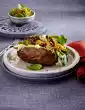 Cut the tortilla into pieces. Arrange on plates and serve garnished with tomato slices, onion sticks, olives and oregano.