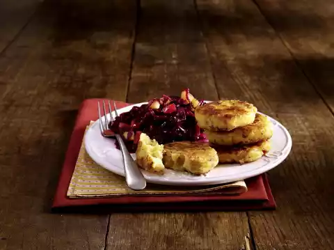 Fold in egg yolk and ham and season with salt and nutmeg. Form 16 cookies from the potato mixture. Peel and quarter the apple, remove the core, cut the fruit flesh into pieces. Add apple and redcurrant jelly to the red cabbage.