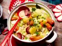 Add red cabbage, bay leaf, juniper berries, cinnamon stick and red wine. Season with vinegar, salt and sugar. Bring to the boil and simmer for 45-60 minutes. Peel, wash and halve potatoes and cook in boiling salted water for about 20 minutes.