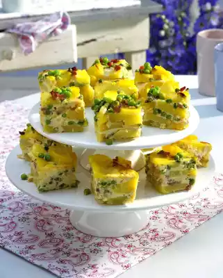 Cut potatoes into slices. Grease a mould (approx. 30 x 20 cm). Alternately layer potatoes, bacon mixture and peas in the mould. Pour the egg milk over them. Bake in the preheated oven (electric cooker: 200 °C/ convection oven: 175 °C/ gas: level 3) for 40-45 minutes. Let it cool down. Serve cut into cubes
