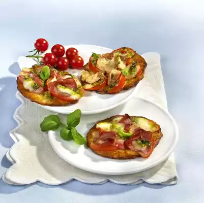 Place the potato pancakes on a baking tray lined with baking paper. Cover with tomatoes, mozzarella and alternately with salami and tuna. Bake in the preheated oven (electric cooker: 200 °C/ convection oven: 175 °C/ gas: level 3) for approx. 10 minutes. Sprinkle pizzas with pesto. Arrange on plates, garnish with basil and cherry tomatoes