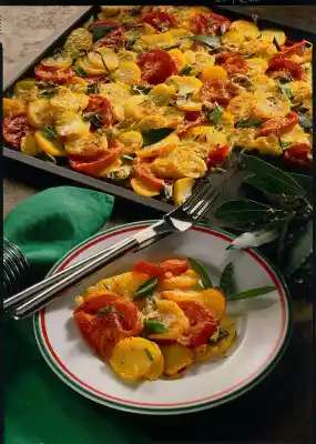 Wash the rosemary, pluck the needles. Cut the potatoes into slices and put them mixed with tomatoes and spring onions on a greased baking tray (30 x 32 cm). Sprinkle with salt, pepper and rosemary needles.