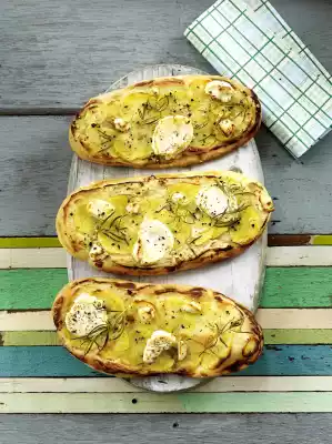 Quarter the dough and form each into an oval pizza (approx. 20 cm long) on a floured work surface, place on a baking tray lined with baking paper and spread the sour cream mixture on top. Spread potato slices on the pizzas. Cut cream cheese into slices and spread on the pizzas. Wash the rosemary, shake dry and pluck into small twigs. Spread on the pizzas. Sprinkle with pepper and drizzle with 1 teaspoon of olive oil on each. Bake in the preheated oven (electric cooker: 225 °C/ convection oven: 200 °C/ gas: level 4) for 12-15 minutes