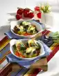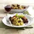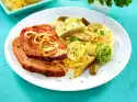 Heat the rest of the bacon again. Sauté the mushrooms in it. Fry the leek briefly. Add 300 ml water and cream, bring to the boil. Stir in stock and thicken with sauce thickener, season to taste. Arrange everything and garnish if necessary