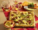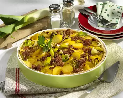 Put the potatoes, minced meat and leek on the floor. Whisk 4 eggs and milk. Season with salt, pepper and nutmeg. Pour egg milk into the mould. Cook the quiche in the preheated oven (electric cooker: 175 °C/ convection oven: 150 °C/ gas: level 2) on the lower level for about 1 1/4 hours.