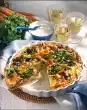 Cut the potatoes into slices. Knead dough on a floured work surface until smooth and roll out round (approx. 30 cm Ø). Place the dough in a greased, round quiche tin (26 cm Ø), pressing the rim down.