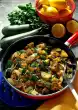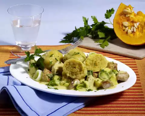 Drain the potatoes and press them onto a tray with a potato press and let them cool down. Wash the turkey meat, dab dry and cut into cubes. Peel and finely grate the pumpkin. Mix flour, cold potato mixture, semolina, eggs and pumpkin and season with salt, pepper and nutmeg. Turn 1 sample dumpling and let it simmer in boiling salted water for about 15 minutes. If the dumpling is too soft, add some potato flour to the mixture. Form 12 dumplings and let them simmer. Heat 1 teaspoon of oil in a coated pan. Fry the turkey cubes for 2-3 minutes while turning, then remove from the pan. Heat 1 teaspoon of oil in a frying pan. Sauté the onion cubes for 1-2 minutes and dust with curry.