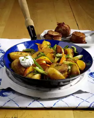 Wrap each with a slice of bacon. Heat the oil in a large pan, fry the meat for 3-4 minutes on each side, season with salt and pepper. Remove and keep warm. Fry the potatoes in the frying fat for about 10 minutes, turning several times.