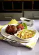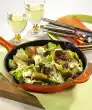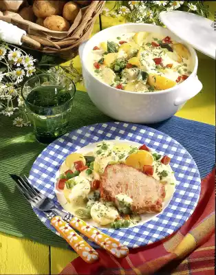 Fry the bell peppers and spring onions for about 3 minutes in a tablespoon of hot oil. Add to the sauce with the potatoes and peas and heat for 5 minutes together. Dab smoked pork loin dry and fry in the remaining oil on both sides for about 3 minutes. Wash the chives, dab dry and cut into small rolls. Sprinkle over the ragout. Add the Kasseler