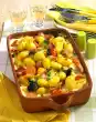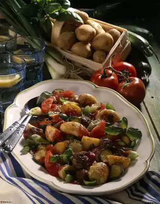 Drain the potatoes and let them drip off. If necessary, cut in half or quarter them. Fry the potatoes, spring onions and zucchini in the cooking fat. Add tomatoes and steam briefly. Pour in the strained tomatoes and stock and cook for five to eight minutes.