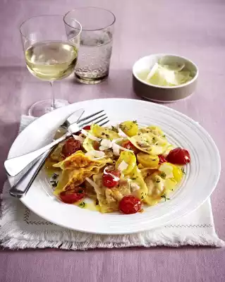 Wash and drain the thyme. Wash and halve the tomatoes. Heat 1 tablespoon of olive oil in a frying pan and braise the tomatoes for about 5 minutes. Season with salt and pepper, add honey and thyme. Add butter and let it melt, then add the ravioli to the pan and fry for 2-3 minutes. Arrange on plates. Serve with pecorino cheese