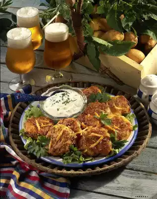 Season with salt and pepper. Form 8 meatballs from the potato mixture with floured hands and roll in sesame seeds. Heat the oil. Fry the potato burgers for 8-10 minutes in portions while turning.