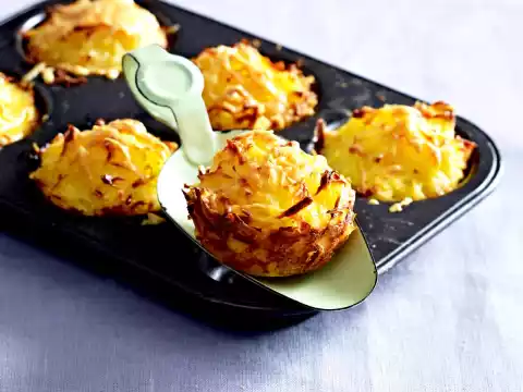 Grease the recesses of a muffin tray (12 recesses). Peel, wash and roughly grate the potatoes. Leave to stand for a short time, squeeze out a little and mix with 200g grated Gouda and eggs. Season with salt and nutmeg.