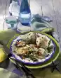 Cut into large cubes and season with salt and pepper. Heat the remaining oil in a coated pan and fry the fish cubes all around. Remove and put aside. Fry the spring onions and cherry tomatoes in the frying fat. Deglaze with vegetable stock and stir in the crème fraîche. Season with salt and pepper. Add gherkins and capers. Bring the sauce to the boil and stir in the sauce thickener. Warm the fish cubes in the sauce.