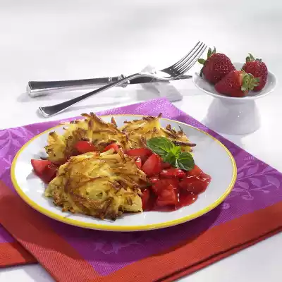 Stir in the strawberries and let it cool down. Peel, wash and roughly grate the potatoes. Mix grater with egg yolk and season with salt. Heat oil in a coated pan and fry 3 Rösti over medium heat, turning once.