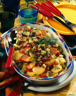 Season with salt and pepper. Pour over the potatoes while still hot. Fold in sausages and gherkins. Cover and let it simmer for about 30 minutes. Meanwhile wash the dill, dab dry and chop. Mix with mustard and honey. Pour over the salad, season to taste again and serve garnished with the remaining dill