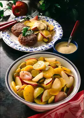 Wash apples, quarter them, cut out the core. Cut apple quarters into pieces and sprinkle with lemon juice. Cut potatoes into slices. Put vinegar in a pot and season with salt, pepper and sugar. Add onion slices, heat everything up. Pour over the potatoes while still hot. Fold in remaining prepared ingredients. Cover and leave to infuse for at least 1/2 hour. In the meantime, mix soured milk and mustard for the dip. For the meatballs, soak rolls in water. Finely dice the remaining onion. Knead minced meat, squeezed out roll, onion and egg.