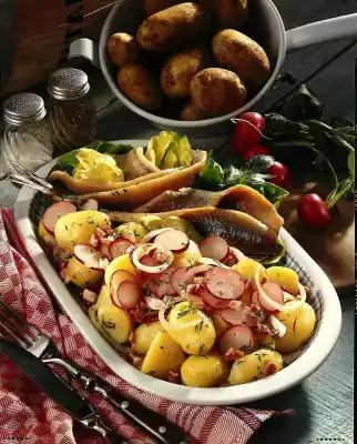Heat vinegar and broth in bacon fat. Add onion rings. Season with salt and pepper. Stir in oil and pour immediately over the potatoes. Cover and leave to stand for about 1/2 hour. Season to taste again before serving. Serve with matie filets