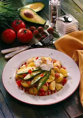 Wash potatoes thoroughly and cook in boiling salted water for 15-20 minutes. Wash the tomatoes and remove the stalk. Cut tomatoes into quarters, remove seeds and dice. Peel and quarter the onion and cut into strips. Wash chives and cut into small rolls. Bring the stock to the boil, season to taste with vinegar, salt, sugar and pepper.