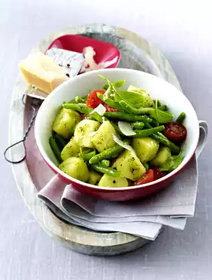 Peel potatoes and cut into cubes. Mix the potato cubes and beans with the pesto dressing and let it stand for about 30 minutes, stirring occasionally. Wash and halve the tomatoes and stir into the salad. Arrange salad in bowls. Sprinkle with parmesan slices. Garnish with basil leaves