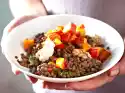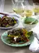 Wash the potatoes and cook in boiling water for about 20 minutes. Meanwhile cook the beans in boiling salted water for about 7 minutes. Drain beans and rinse with cold water. Drain potatoes, quench and let cool down a little. Beat the stock, pesto, vinegar and oil. Season with salt, pepper and sugar.