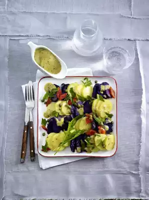Drain the potatoes, rinse with cold water and peel. Leave to cool. Drain capers. Peel the skin off the peppers, chop the peppers into small pieces. Cut potatoes into slices. Whisk 2 tablespoons vinegar and 2 tablespoons oil, mix potatoes with it. Arrange potato slices decoratively on plates or a large platter. Sprinkle with paprika, capers and rocket. Garnish with rocket leaves. Drizzle vinaigrette over it