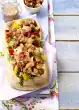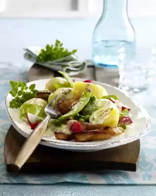 Wash the potatoes well and cook in boiling water for about 20 minutes. Wash and clean the mangetouts. Cook the sugar snap peas and peas in boiling salted water for about 5 minutes. Drain and rinse with cold water.