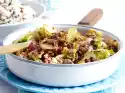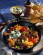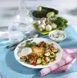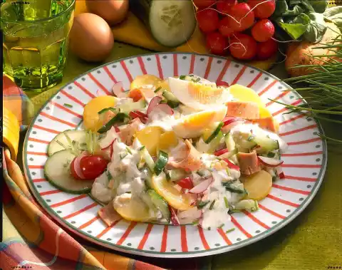 Mix everything with broth and vinegar, let it stand. Season yoghurt, fold in. Sprinkle with chives
