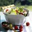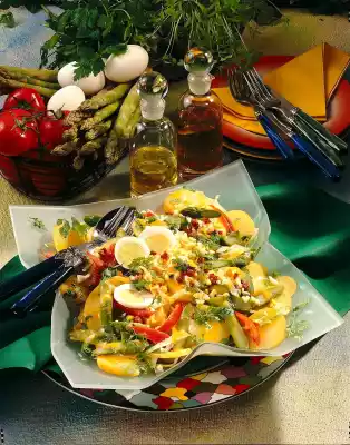 Wash the asparagus, cut off the ends. Cut the asparagus into pieces. Cook in 1/8 l salted water with sugar for about 10 minutes, lift out. Clean, wash and chop the tomatoes and salad. Mix everything with potatoes