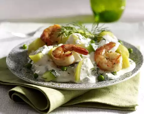 Wash the cucumber, dab dry and cut into cubes. Mix horseradish, yoghurt and sour cream, season to taste with salt, pepper and a little sugar. Quarter the potatoes and put them in a bowl with cucumber, dill and peas.