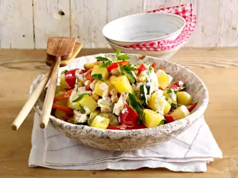 Drain the chickpeas in a sieve. Wash the parsley and dab dry. Pluck off the leaves and chop them coarsely, except for a little to garnish. Drain potatoes, rinse with cold water, peel and dice.