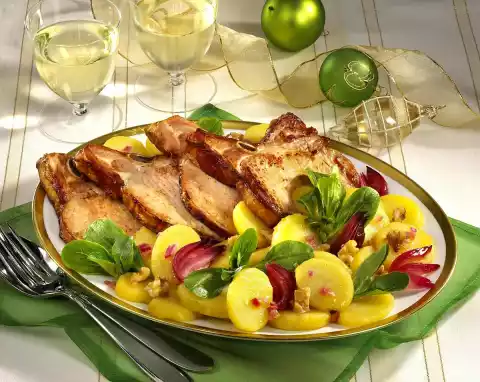 Add onion cubes and slices to the stock and set aside. Drain potatoes, quench, peel, let cool slightly and cut into slices. Pour the marinade over the potatoes and leave to stand. Heat 2 tablespoons of oil in a pan. Fry the smoked pork chops for 8-10 minutes while turning. Clean, wash and drain the lamb's lettuce. Season the potato salad with salt, pepper and sugar again. Coarsely chop the walnuts. Arrange chops, potato salad and lamb's lettuce on a plate.