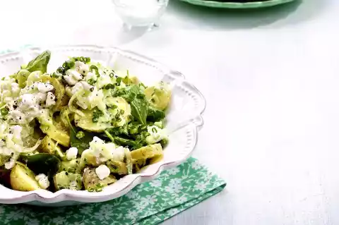 Peel and finely chop the garlic. Grate the remaining cucumber. Mix cottage cheese, cucumber and garlic, season to taste with salt and pepper, chill. Cut potatoes into slices and mix with the dressing, season again with salt and pepper.