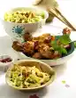 Peel the garlic and press it through a garlic press. Mix yoghurt, mayonnaise and lemon juice. Season with salt, sugar and pepper. Stir in the garlic and half the onions. Cut the potatoes into slices.