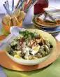 Wash the cucumber and paprika. Quarter the cucumber and cut into pieces. Clean the paprika and cut into pieces. Clean, wash and chop the tomatoes. Wash lettuce and cut into strips. Peel and finely dice onions.