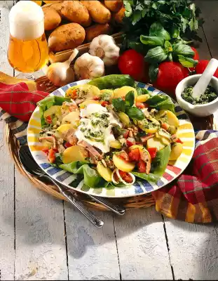 Clean, wash and chop the tomatoes and onions. Drain potatoes, quench, peel and let cool. Then cut into slices