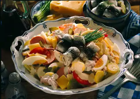 Wash the potatoes and cook in boiling water for about 20 minutes. In the meantime, cut the cheese into pieces. Wash, clean and halve the tomatoes and cut them into slices. Boil the eggs for 10 minutes, rinse with cold water, peel and quarter them lengthwise. Cut gherkins into slices.