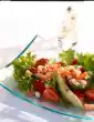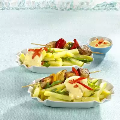 Carefully mix the potatoes, rocket and marinade, cover and leave to stand for approx. 30 minutes. In the meantime, wash the schnitzel meat, dab dry and cut into cubes of about 3 cm. Clean, wash and cut the peppers into pieces. Peel and quarter onions. Put prepared ingredients alternately on skewers. Heat 3 tablespoons of oil in a pan. Fry the shish kebabs for about 10 minutes while turning. Season with salt, pepper and paprika. Wash, clean, quarter and seed the tomatoes. Cut the flesh into small cubes and strips. Mix mayonnaise and crème fraîche. Season with salt and pepper.