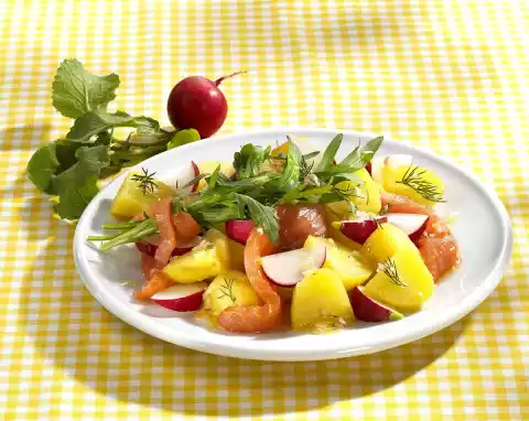 Clean, wash and slice the radishes. Cut salmon into strips. Clean the rocket and wash it thoroughly. Mix the prepared ingredients. Bundle the rocket as desired and wrap with salmon strips. Arrange potato salad on plate
