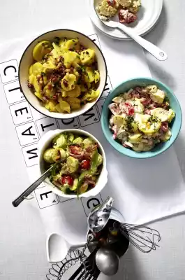 Wash potatoes thoroughly and cook in boiling water for about 20 minutes, rinse with cold water, peel and slice the potatoes. Place in a bowl. Boil eggs in boiling water for about 10 minutes until hard. Quench cold and peel off the skin. Wash, clean and chop the tomatoes. Drain the gherkins and collect the stock. Cut the gherkins into slices