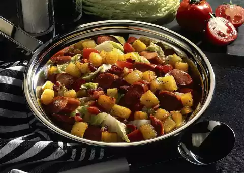 Peel, wash and dice the potatoes. Clean and quarter the Chinese cabbage and remove the stalk. Cut cabbage quarters into strips. Slice the sausages. Finely dice bacon. Wash the tomatoes and remove the stem. Cut tomatoes into small cubes. Heat oil in a pan. Fry the bacon until crispy. Remove and put aside. Fry the potatoes in the bacon fat for about 15 minutes, turning occasionally. Add Chinese cabbage and sausages and fry for 5 minutes. Add tomatoes and diced bacon and warm up. Season with salt and pepper